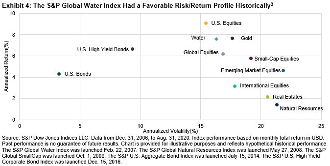 3 “Water” represents the S&P Global Water Index, “Natural Resources” represents the S&P Global Natural Resources Index, “Global Equities” represents the S&P Global BMI, “U.S. Equities” represents the S&P 500®, “International Equities” represents the S&P Developed Ex-U.S. BMI, “Emerging Market Equities” represents the S&P Emerging BMI, “Small-Cap Equities” represents the S&P Global SmallCap, “U.S. Bonds” represents the S&P U.S. Aggregate Bond Index, “U.S. High Yield Bonds” represents the S&P U.S. High Yield Corporate Bond Index, “Gold” represents the S&P GSCI Gold, and “Real Estate” represents the Dow Jones Global Select Real Estate Securities Index.