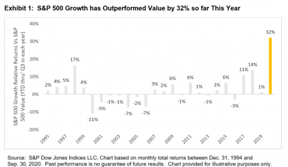 Growth style investing has outperformed value for over a decade but its relative returns against value so far in 2020 have been unprecedented: the S&P 500® Growth index boasts its highest-ever year-to-date relative returns (+32%) versus its value counterpart through the third quarter. This comes despite growth’s eight-month winning streak coming to an end in September.