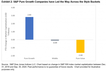 Amid declining interest rates earlier this year and growth companies’ higher sensitivities to discount factors, it is perhaps unsurprising that growth’s year-to-date relative returns have been driven by the outperformance of the most growth-like names in the market. Indeed, the total index market capitalization of “pure growth” S&P 500 companies—those with a growth exposure score of one, meaning they have 100% of their free-float market capitalization allocated to the S&P 500 Growth index—rose by nearly USD 3 trillion in the first three quarters of 2020. This increase was larger than the United Kingdom’s USD 2.2 trillion index market capitalization in the S&P Global BMI at the end of September.