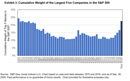 Much has been written recently about the outperformance of the largest names in the market in 2020, prompting concentration concerns by some market participants. Exhibit 3 shows that the five largest companies in the S&P 500 currently account for around 23% of the index, similar to the levels observed in the 1970s and up from 17% at the end of 2019.