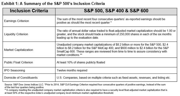 Instead, our equity indices methodology identifies several eligibility criteria that new index additions must meet, including, but not limited to, market capitalization and liquidity thresholds, along with a history of positive earnings. Exhibit 1 provides an overview of these requirements.