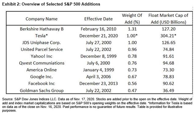 Importantly, the growth of the S&P 500’s market capitalization over the last decade—from USD 9 trillion to around USD 30 trillion today—means that Tesla’s weight upon addition (1%, using Nov. 16’s close) would be less than Berkshire Hathaway’s 1.3% index weight when it was added.