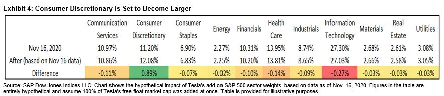 From a sector perspective, Tesla’s addition is also likely to increase the weight of Consumer Discretionary in the index and help to alleviate the benchmark’s sensitivity to the Information Technology sector. For example, assuming all of Tesla were included at once, as of Nov. 16’s close the Consumer Discretionary sector would be 12.08% of the S&P 500 (this figure is based on the S&P 500 having 501 companies instead of its usual 500—the stock Tesla will replace in the index has yet to be announced by the Index Committee).