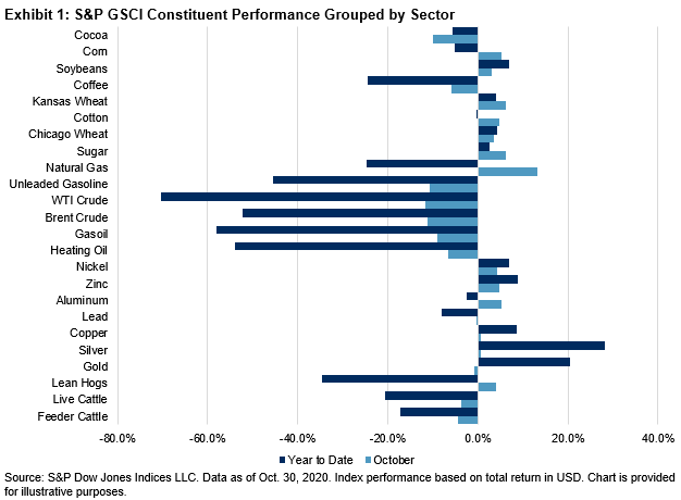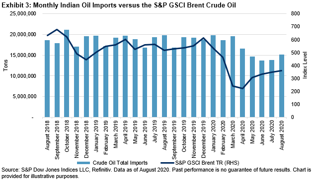 Discussions regarding a K-shaped recovery from COVID-19 highlight disparities across different commodity sectors. India seems to be experiencing its own version of this, with some areas improving faster and stronger than others. Decreased importation costs have served as a tailwind to help India. Energy accounts for about one-third of India’s total imports, and as crude oil prices collapsed around the world from the simultaneous demand and supply shock, India found that the cost of doing business dropped significantly. Most commodity prices dipped in the first half of the year, following moves in other asset classes. Exhibit 1 shows the YTD and October 2020 performance of the 24 constituents in the S&P GSCI. Grouped by sector, the negative YTD performance of the energy-related commodities clearly stands out; however, the other sectors seem to be rounding the turn.