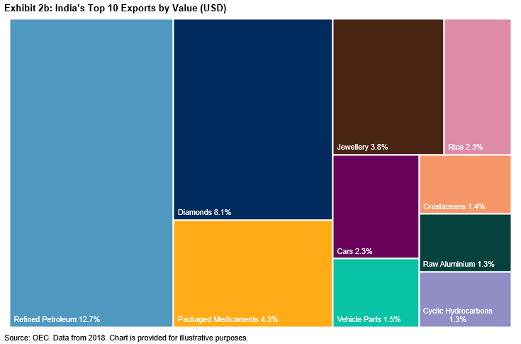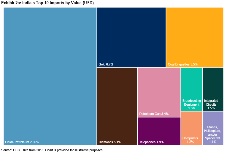 Before dissecting the current situation, it is important to put India’s trade relationships and major commodity exports and imports in a global context. With China’s dominance in world trade, it would be intuitive to think it has an outsized trading relationship with India, but China only made up approximately 15% of total imports as of 2018. China is India’s largest trading partner, but after that, imports are more evenly distributed across many trading partners. The most prominent destination for Indian exports is the U.S. Approximately 20% of exports to the U.S. consist of diamonds, jewelry, and precious metals.