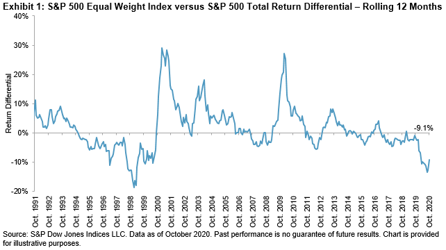 The S&P 500® rose by 10% in the 12 months ending on Oct. 31, 2020, trouncing the S&P 500 Equal Weight Index by 9.1%, as seen in Exhibit 1. While such outperformance is not unprecedented, it does remind us of previous market peaks (especially in December 1999), and raises questions about whether a reversal may be in the cards.