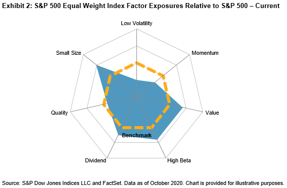 Currently, the equal weight version has a strong tilt away from low volatility and momentum, and a slight tilt away from quality. It also has exposures toward small size, dividend yield, high beta, and value. In other words, compared to the average stock in the index, the S&P 500 itself is less volatile, more momentum-oriented, more expensive, and much larger.