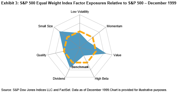 But when we go back further in history, we observe significant differences between today’s factor dynamics compared to those in December 1999. We observe in Exhibit 3 that like today, the equal weight version had a strong tilt away from momentum and toward small size, but that is where the similarities end. Twenty years ago, the S&P 500 Equal Weight Index barely had a tilt away from low volatility, deeper exposures to quality and dividend yield, along with a strong tilt away from high beta. Therefore, compared to the average constituent, the S&P 500 was much more volatile and not as durable from a quality perspective.