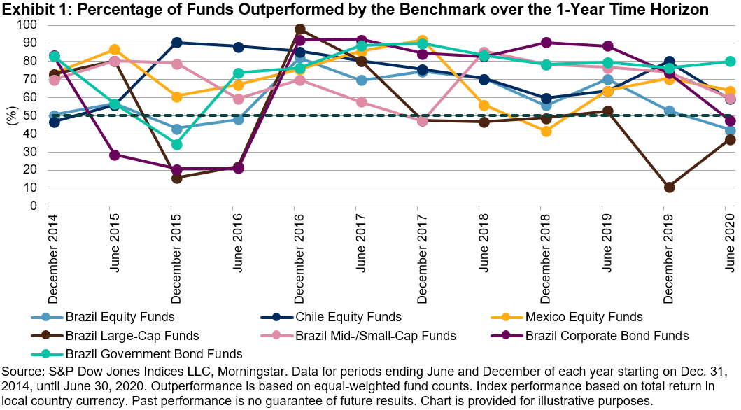A compilation of the Latin America SPIVA scorecards from year-end 2014 to mid-year 2020 show that when observing one-year periods, Chilean active managers outperformed in December 2014; Brazilian active managers outperformed in one or more of their categories in June 2015, December 2015, and June 2016; and the majority of Mexican equity active managers were able to beat their benchmarks in December 2019 (see Exhibit 1).