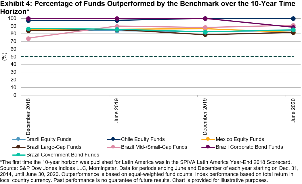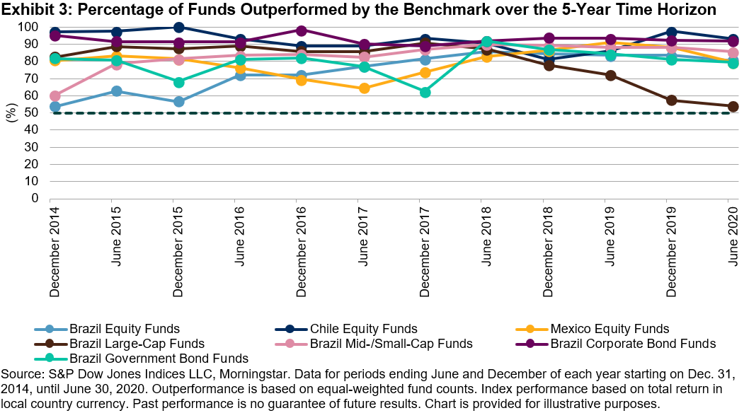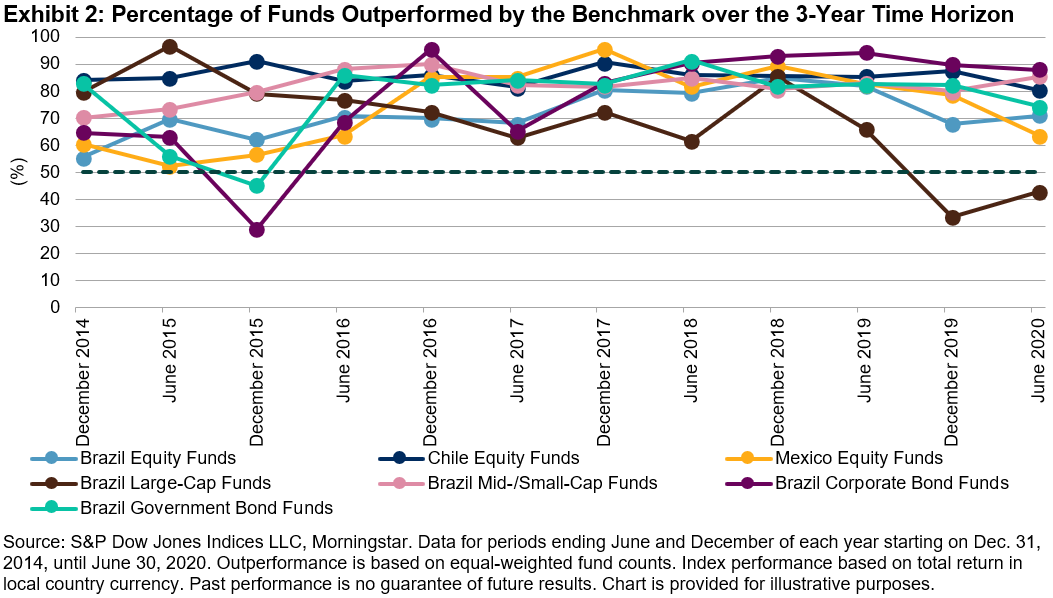 However, Brazilian active managers in the Brazil Equity Funds, Brazil Large-Cap Funds, and Brazil Corporate Bond Funds categories managed to take advantage of the circumstances in the short term. We have seen this outperformance by active managers on a short-term basis in the past as well.