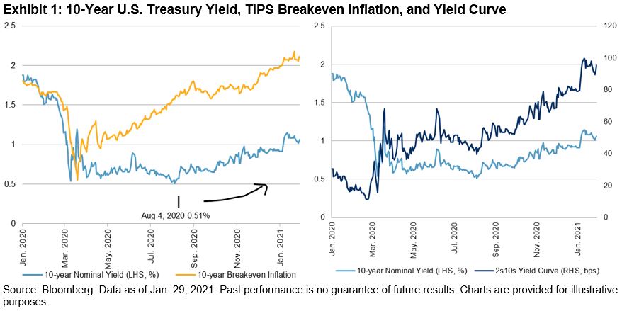 From Aug. 4, 2020, to the end of January 2021, the 10-year U.S. Treasury yield rose 56 bps, accompanied by a steadily rising breakeven inflation rate and steepening yield curve. The 10-Year Breakeven Inflation Rate rose by 53 bps over the same period. (This rate reflects the market’s inflation expectation and is calculated as the yield difference between the 10-year U.S. treasury note and Treasury Inflation-Protected Securities [TIPS]). Real yields on TIPS across the curve are trading in negative territory. On Jan. 21, the 10-year TIPS new-issuance auction drew yield at -0.987%, only 13 bps higher than Jan. 4’s record low. The 2s10s yield curve steepened by 56 bps since last August, to the steepest level since 2018.