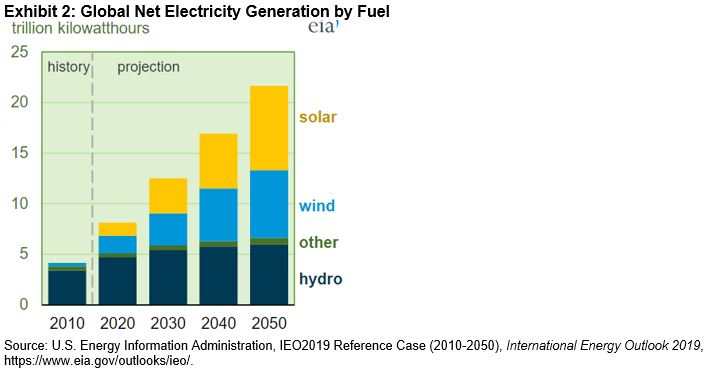 The U.S. Energy Information Administration (EIA) forecasts that power generation coming from renewable sources, such as wind, solar, hydro, and geothermal, should provide the majority of the world’s energy needs by 2050.1 The use of renewable energy has been increasing significantly over the last decade, however its current level of consumption still lags those of traditional sources of energy.