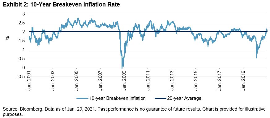 The Breakeven Inflation Rate rebounded strongly from the pandemic-induced low in March 2020. However, to put it into historical context, the 10-Year Breakeven Inflation, at 2.10% as of the end of January, is 9 bps above the 20-year average and 17 bps above the 10-year average. In comparison, economists are forecasting 2.1% for 2021 inflation, according to a January survey conducted by Bloomberg. The latest inflation data, released on Jan. 13, showed a small increase, to 1.4% year-over-year.