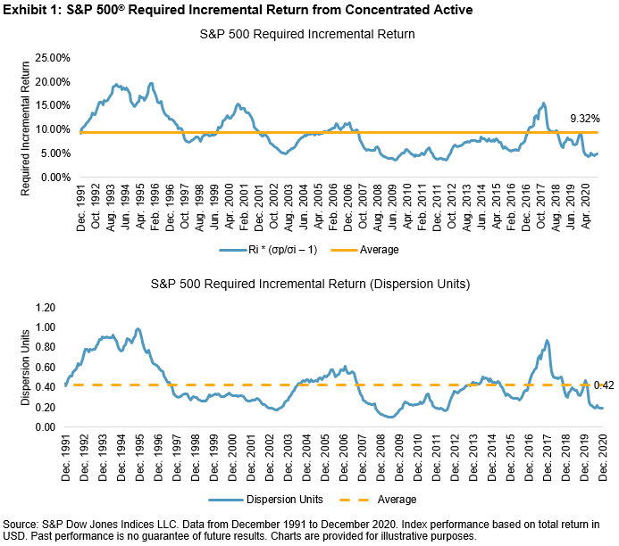 The top half of Exhibit 1 illustrates how the required incremental return for large-cap active managers declined in 2020, as correlations rose. In order to understand how difficult it is to earn the incremental return, we can divide the required incremental return by dispersion, as shown in the bottom half of Exhibit 1. The decline in required incremental return below its long-run average suggests that conditions in 2020 were more favorable (or less unfavorable) than usual for active managers.