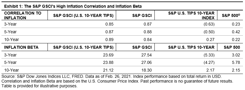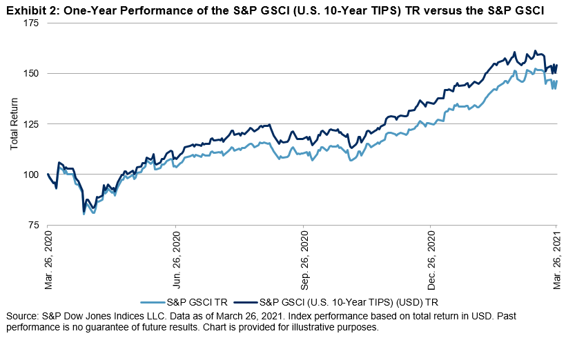 The newly launched S&P GSCI (U.S. 10-Year TIPS) TR was designed with inflation protection in mind. This index takes the renowned broad commodity market benchmark, the S&P GSCI, and aims to add boosted return potential from an exposure to on-the-run U.S. 10-Year Treasury Inflation-Protected Securities (TIPS). Normally, the S&P GSCI TR includes the collateral yield from the U.S. 3-Month T-Bill rate. The S&P GSCI (U.S. 10-Year TIPS) TR exchanges that T-Bill rate for the U.S. 10-Year TIPS, represented by the S&P U.S. TIPS 10-Year Index. If we are entering a period of high inflation, collateralizing commodity exposure with TIPS may be attractive to some market participants. Historically, real assets, including commodities, real estate, infrastructure, and inflation-linked bonds have exhibited a positive correlation to inflation. A strategy that combines commodities and inflation-linked bonds may help hedge inflation risk and maintain the purchasing power of the investment.