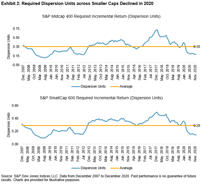 We see similar results in Exhibit 2 for smaller-cap active managers, as the required dispersion units for the S&P MidCap 400® and S&P SmallCap 600® declined below their historical average as well, signaling a relatively easier environment for active management.