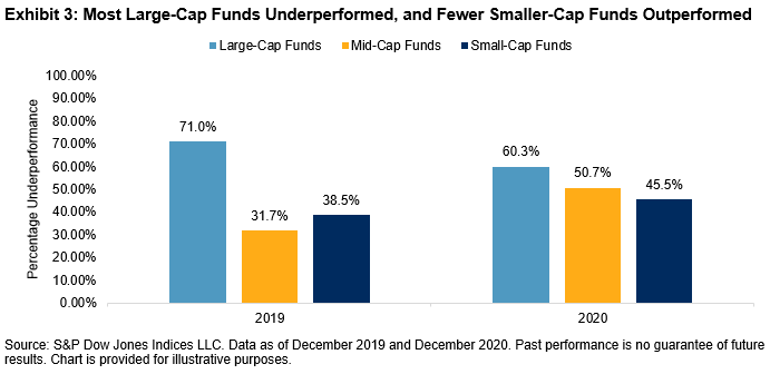 However, our U.S. SPIVA results in Exhibit 3 show that most large-cap funds still underperformed in 2020, although by a bit less compared to their 2019 results. Most smaller-cap funds outperformed, but surprisingly they had done even better in 2019, when conditions for active were more challenging.