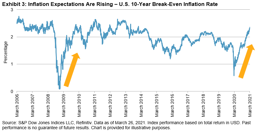 The S&P GSCI (U.S. 10-Year TIPS) TR may offer market participants the opportunity to hedge against the risks of inflation. Historically, commodities outperformed during inflationary times. During prior periods of extreme volatility, like the COVID-19 lockdown drop and Global Financial Crisis, market participants expected the worst and reset their inflation expectations lower. Exhibit 3 shows what happened to inflation expectations during shocks to the markets and how quickly they recovered.