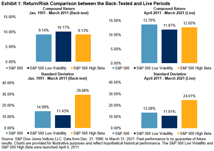 On April 4, 2011, S&P DJI launched two strategy indices, the S&P 500® Low Volatility Index and the S&P 500 High Beta Index. Ten years of live history let us compare how the two indices actually performed versus their pre-launch back-tests.