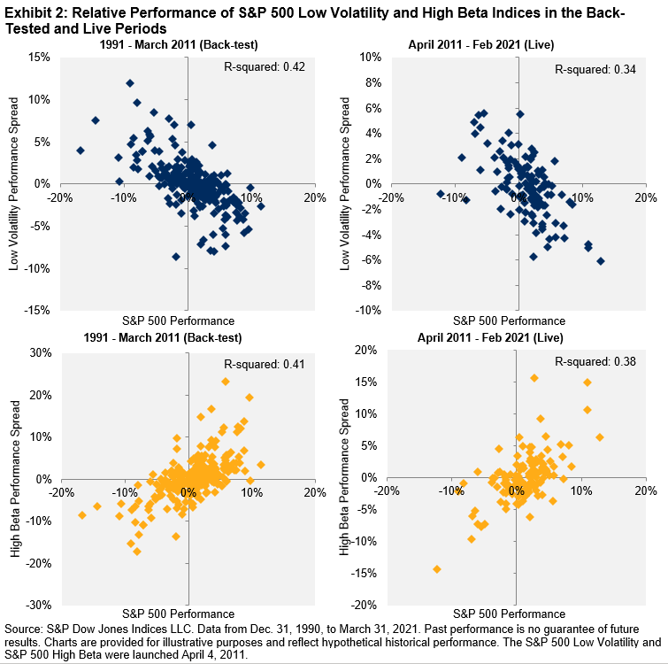 In the back-tested period from 1991 through March 2011, Low Volatility outperformed the benchmark S&P 500 with lower risk, while High Beta underperformed with higher risk. In the live period, Low Volatility underperformed while maintaining its goal of lowering volatility. High Beta’s live relative performance and risk were both comparable to those of the back-tested period.