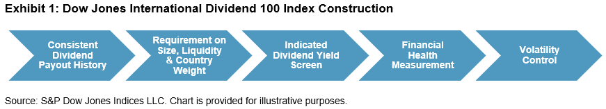 Here we review the methodology of this index’s construction. The Dow Jones International Dividend 100 Index is comprised of non-U.S. large- and mid-cap companies that exhibit consistent dividend payout history, strong fundamentals, and relatively low volatility. Exhibit 1 outlines the key process of the index construction, which involves multi-layered screens to incorporate various factors.