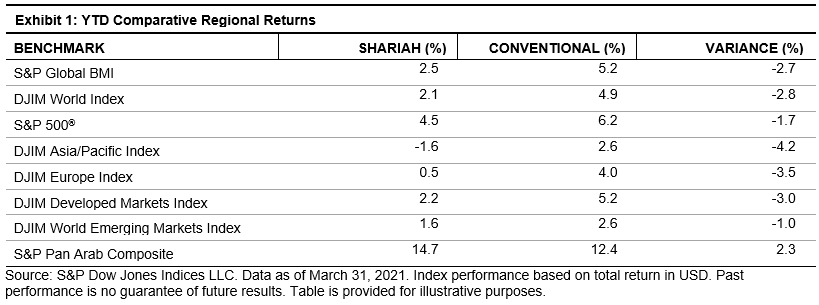 Global equities continued to rise during Q1 2021, gaining 2.5%, as measured by the S&P Global BMI. Shariah-compliant benchmarks, including the S&P Global BMI Shariah and Dow Jones Islamic Market (DJIM) World Index, underperformed their conventional counterparts in Q1, in part due to the strong performance of the Financials sector, which gained nearly 12% during the period. Apart from Asia Pacific, all regional Shariah and conventional benchmarks returned positive performance during the quarter.