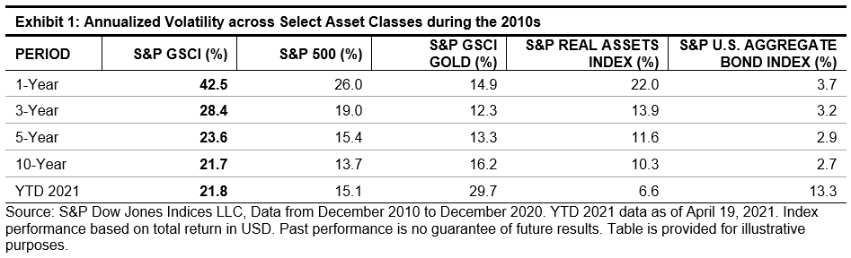 What a difference a year makes. April 21, 2021, marks the one-year anniversary of the S&P GSCI’s low. Since then, we have entered a different economic, social, and geopolitical environment, and the S&P GSCI was up 60% as of April 19, 2021. On March 26, 2020, three days after the low in the S&P 500®, I wrote a blog called Rapid Reset, discussing the market sentiment, what to look for in the short term, and potential structural shifts in commodities markets. This included the potential for a peak in commodities supply after many years of gluts in most commodities. Since this time last year, a dramatic reduction in oil production, loss of agriculture crop supply, and huge draws on industrial and precious metals coalesced to push commodities prices in some cases to new all-time highs. With changes in market dynamics, highly volatile scenarios played out, and the start of the 2020s displayed some of the highest volatility in recent history.