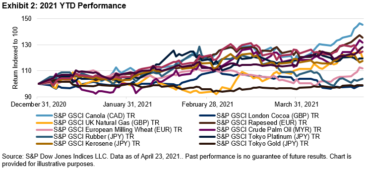 These indices not only offer a non-U.S. dollar exposure to natural resources, but also assist with the financialization of alternative commodities markets, some of which are completely new, and others that are alternatives to more-established futures markets. Exhibit 2 illustrates the 2021 YTD performance of many of these commodities.