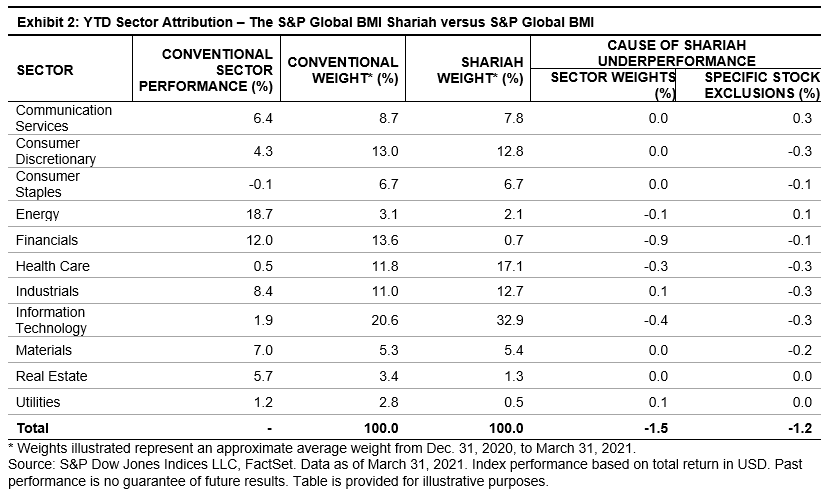 While global equities largely recovered from the global market sell-off of 2020, sector performance continued to vary widely into the first quarter of 2021. Although Energy led Q1 sector performance, its small weight had little impact on overall returns. Meanwhile, Financials—which is nearly absent from Islamic indices—heavily outperformed the broader market, and Information Technology—which tends to be overweight in compliant indices—underperformed on a relative basis. These two sectors, along with Health Care, accounted for a large majority of the Shariah underperformance during the quarter.