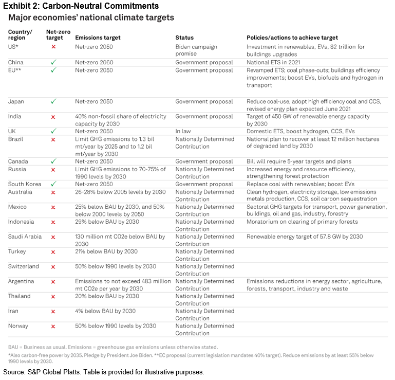 How have the commodities markets shifted to start this new decade? Themes that played out in the 2010s seem to have either hit the brakes or accelerated over the past year. The most prominent change involved energy. One year out from front-month futures crude oil prices dipping into negative territory, it seems unlikely that the oil producers still in business will ever again pump oil without regard for systemic macroeconomic risks. U.S. shale producers just posted the most bankruptcies for a first quarter since 2016, despite crude oil prices being up 30% YTD. With a global focus on green infrastructure and battling climate change, the energy transition has commenced. The world may never again be “swimming in oil.” Electric vehicles are a major driver behind the energy transition, as demand for fossil fuels will likely decrease over the long run. With more and more countries committing to carbon-neutral timelines, oil companies will have to adapt to stay relevant. Exhibit 2 shows the latest country net-zero and emissions targets compiled by S&P Global Platts, a division of S&P Global.