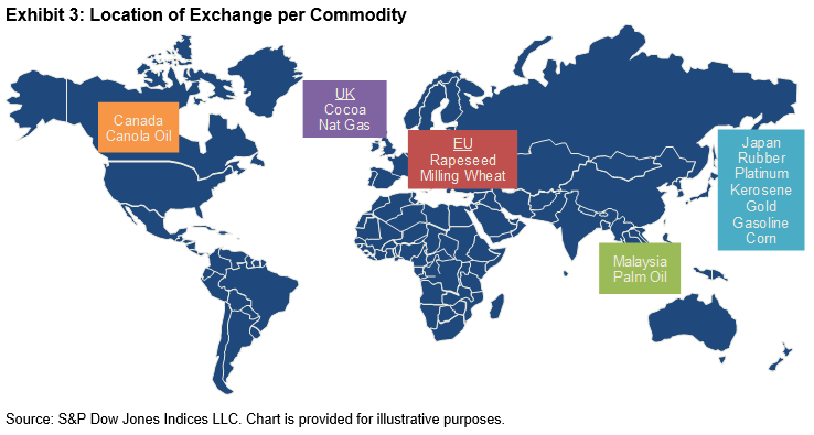 There are good reasons for the recent excitement around these commodities. Several of these commodities are used in renewable diesel applications. Fiona Boal, Head of Commodities and Real Assets at S&P DJI, wrote a twopart blog series discussing the expanding interest in these non-fossil-fuel inputs to renewable energy. Several other of these indices expand the geographic footprint and offer alternatives to the more well-known commodities like gold, corn, and natural gas that are traded on U.S. exchanges. The Tokyo-, London-, Saskatchewan-, Paris-, and Kuala Lumpur-based futures offer commodity participants exposure outside of traditional U.S.-based markets.