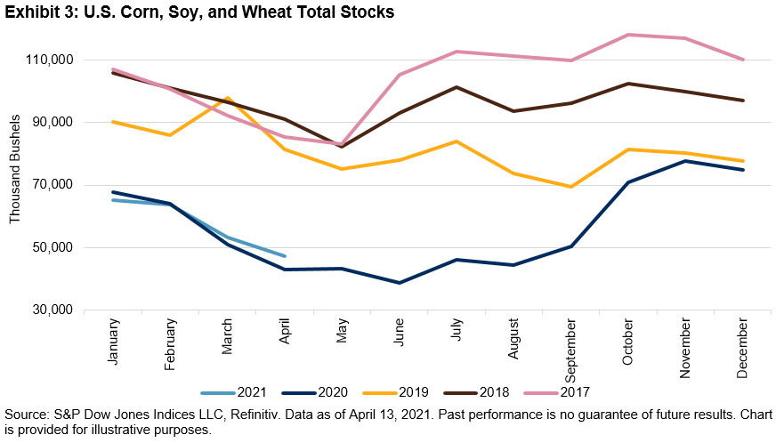 The last quarter of 2020 also marked a turning point in the grains market. For the first time in years, we witnessed a surprise to the downside in grain production in the western hemisphere. Several factors including weather events, farmers reducing acreage due to low prices, and lack of government subsidy assistance all played a role in this bullish supply-driven story. At the end of March 2021, market participants were surprised again by the USDA releasing a dramatically lower-than-expected reading for U.S. grain plantings this season. The tailwinds continued for the grain sector as corn and soybeans made new five-year highs.