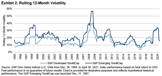 Exhibit 2 shows the 12-month rolling volatility since Dec. 31, 1994, where volatility is calculated as the annualized standard deviation of the monthly total return in U.S. dollars. While the S&P Emerging SmallCap has been more volatile than the S&P Developed SmallCap for most of the time observed, the S&P Developed SmallCap appeared to be riskier than the S&P Emerging SmallCap from December 2018 to April 2021, except from July 2020 to October 2020.