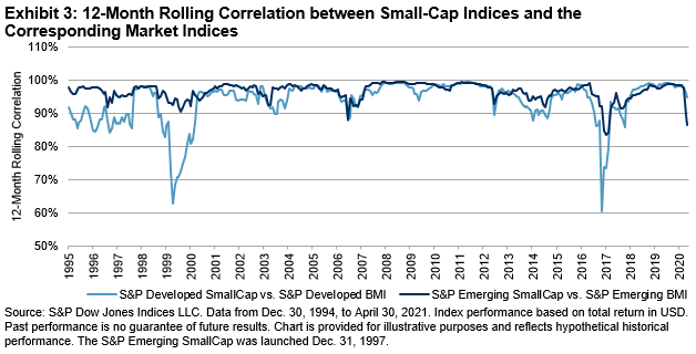 Historically, the S&P Emerging SmallCap has been more closely correlated to the emerging market, as measured by the S&P Emerging BMI, compared with the correlation between the S&P Developed SmallCap and the S&P Developed BMI (see Exhibit 3). This means that in emerging markets, the small-cap stocks have been more closely related to the broader market than small-cap stocks in developed markets over the studied period.