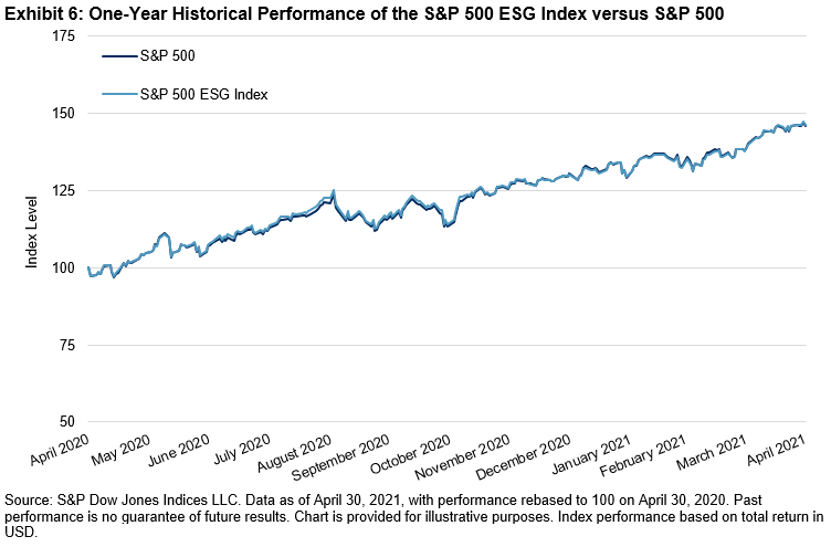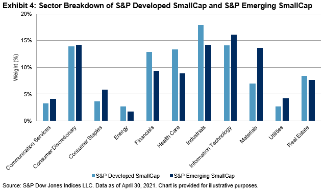 The sector exposure displayed in Exhibit 4 shows that as of April 30, 2021, both the S&P Developed SmallCap and S&P Emerging SmallCap have more weight allocated to Industrials, Information Technology, and Consumer Discretionary than other sectors. The S&P Emerging SmallCap is more overweighted in Materials, Utilities, and Consumer Staples than the S&P Developed SmallCap, while the S&P Developed SmallCap is more overweight in Health Care, Financials, and Industrials than the S&P Emerging SmallCap.