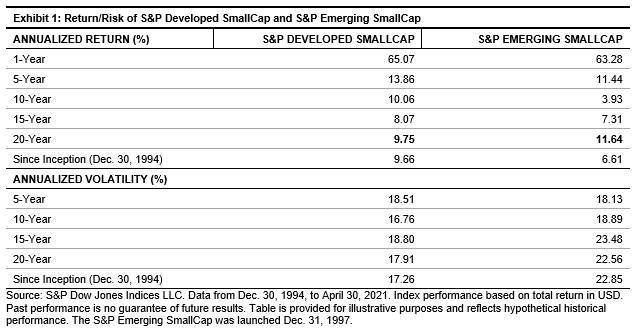 Exhibit 1 shows the return/risk comparison between the S&P Developed SmallCap and S&P Emerging SmallCap. The S&P Developed SmallCap did better in most of the periods, while the S&P Emerging SmallCap outperformed over the 20-year period. The S&P Emerging SmallCap had higher volatility during all the periods studied.
