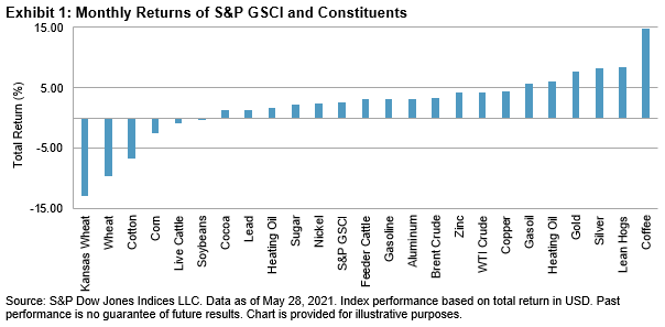 With many of the 24 commodity constituents of the S&P GSCI in backwardation in 2021, a positive catalyst in the form of a positive roll yield is one of the current reasons to look at commodity exposure. After years of negative roll yields, investors are being rewarded for holding commodity exposure. The S&P GSCI Dynamic Roll is designed to benefit from backwardation by holding positions at the front of the futures curve.