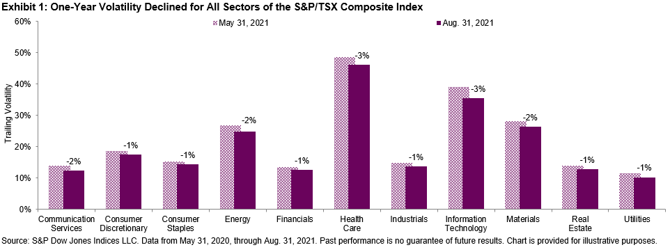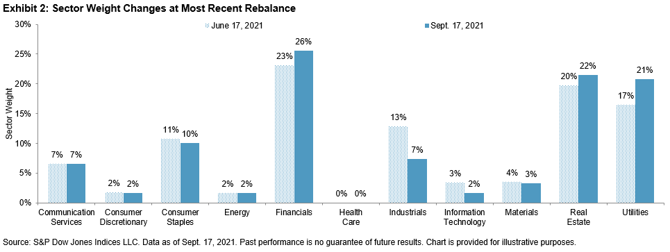 The latest rebalance for the S&P/TSX Composite Low Volatility Index was effective following the close of trading on Sept. 17, 2021. Changes in the index were minimal, but that’s not surprising given what we’ve seen in the sector volatility changes. Financials, Real Estate, and Utilities continue to add weight in the index and are the three largest sectors. Most of the increase came at the expense of Industrials, whose weight declined to 7% from 13%. Health Care, which represents 1% of the S&P/TSX Composite, has no weight in the low volatility index.