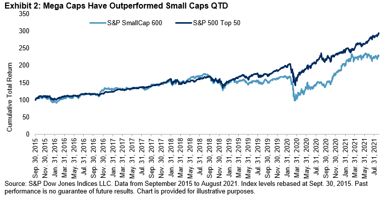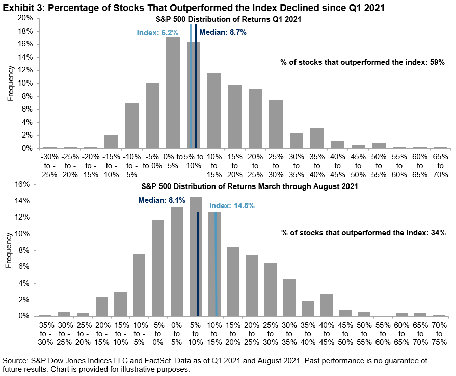 The dominance of mega caps also hinders stock selection, as illustrated in Exhibit 3. In the first quarter of 2021, 59% of S&P 500 members beat the index, when smaller-caps were outperforming. Since then, the tide has turned, and only 34% of stocks outperformed the index, as mega caps outperformed during this period.