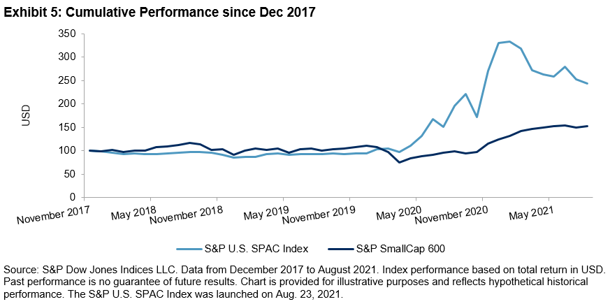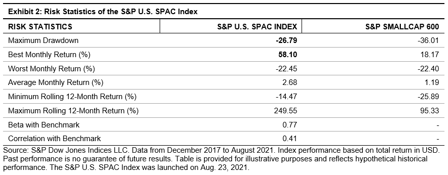 As of Aug. 31, 2021, the median market capitalization of all listed SPACs was USD 270 million, much lower than the median market capitalization of USD 1.6 billion of S&P SmallCap 600® constituents. Since most SPACs are small- or micro-cap companies, we compared the performance of the S&P U.S. SPAC Index against the S&P SmallCap 600, which is used as its benchmark. Historically, the S&P U.S. SPAC Index exhibited better risk/return characteristics than the benchmark, especially over the short- and mid-term periods. In the 45-month back-tested period ending in August 2021, the strategy exhibited a lower maximum drawdown (-26.8%) compared with the S&P SmallCap 600 (-36.1%; see Exhibit 2).