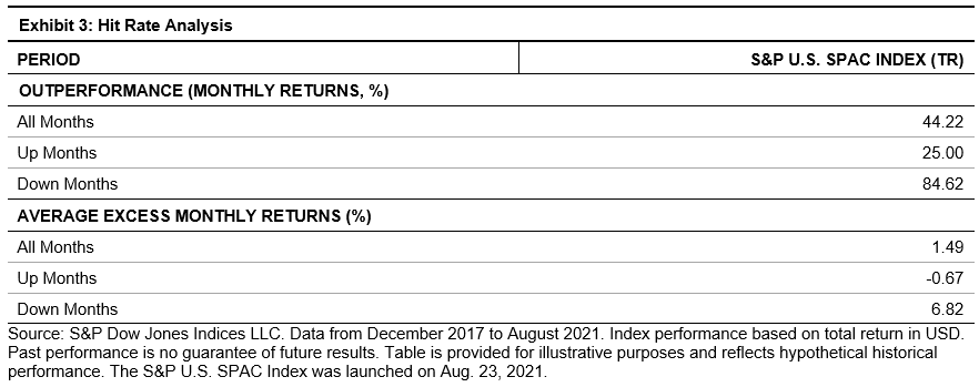 Over the period studied, the S&P U.S. SPAC Index provided downside protection in times of market turbulence. During all the months in which the benchmark was down between December 2017 and August 2021, the S&P U.S. SPAC Index outperformed 84.6% of the time and generated a monthly average excess return of 6.8% over the benchmark1 (see Exhibit 3).