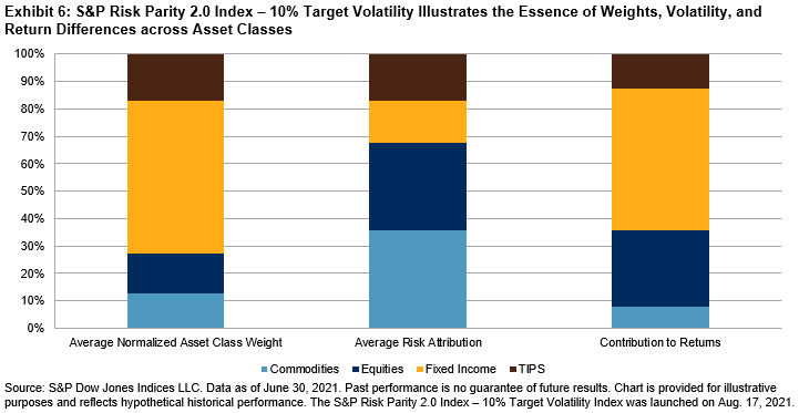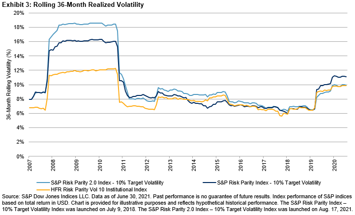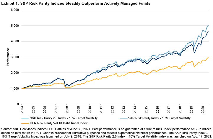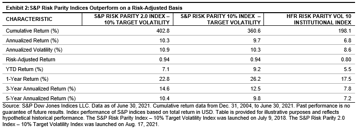 As Exhibits 1 and 2 show, the performance of the S&P Risk Parity 2.0 methodology compares favorably to that of the original risk parity indices and significantly outperformed actively managed funds, as measured by the HFR Risk Parity Vol 10 Institutional Index.