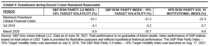 Drawdown periods and performance were similar across the indices. While the S&P Risk Parity 2.0 Index performed better in Q4 2018 and March 2020 than the other indices, it lagged slightly during the Global Financial Crisis.