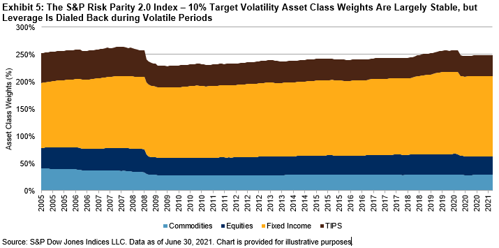 Exhibit 5 shows these leverage drops and the allocated asset class weights over time. The relative commodities and Treasury inflation-protected securities (TIPS) notional allocation have slightly but steadily decreased since inception, with that weight largely being reallocated to fixed income.