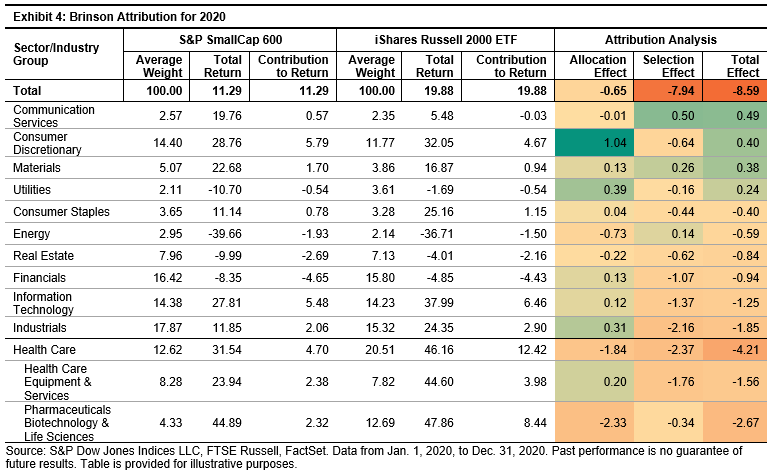In 2020, we can see that the S&P 600 had an average weight of 12.62% in the Health Care sector compared with 20.51% for the Russell 2000, resulting in an underweight of 7.89%. The Health Care sector contributed -4.21% to the -8.59% relative performance of the S&P 600 (or 49%). We can further decompose the performance of the Health Care sector into an allocation effect (the impact of underweighting the sector) of -1.84% and selection effect (the impact of selecting stocks that underperformed their peers in the sector) of -2.37%. Drilling further into the industry groups within the Health Care sector, we can see that Pharmaceuticals, Biotechnology & Life Sciences was the largest contributor, at -2.67%.