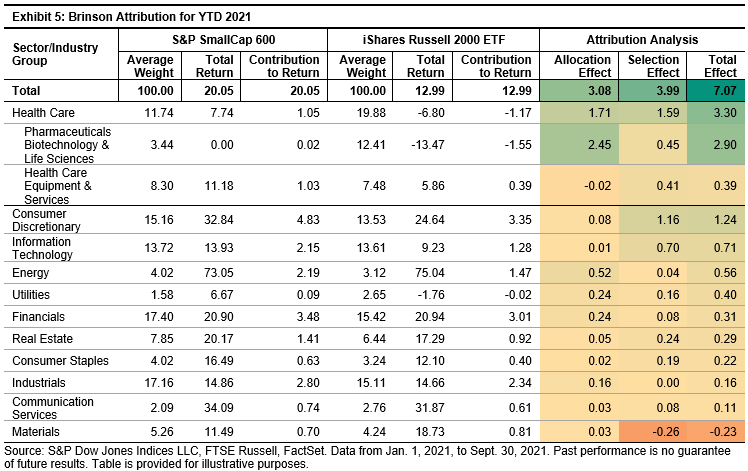A large part of the relative performance in 2020 and 2021 can be explained by the exposure of each index to a single sector—Health Care. Exhibits 4 and 5 show a Brinson Attribution for 2020 and YTD 2021, using the S&P 600 as the portfolio and the Russell 2000 as the benchmark. Here we use the iShares Russell 2000 ETF as a proxy for the Russell 2000, so the returns do not tie out exactly to Exhibit 3.