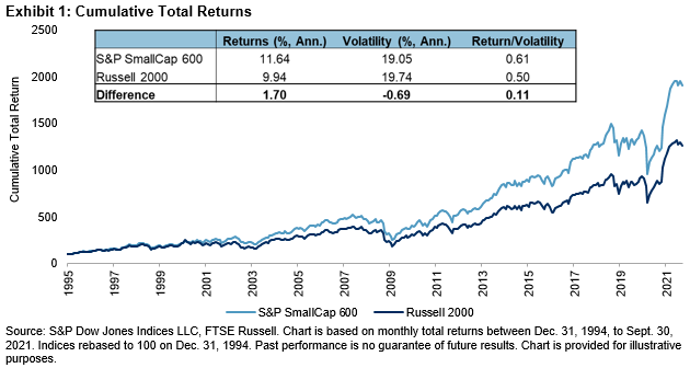 For over 11 years, S&P Dow Jones Indices has been exploring the long-term, persistent outperformance of the S&P SmallCap 600® relative to the Russell 2000. As shown in Exhibit 1, the S&P 600TM has outperformed the Russell 2000 by 1.70% on an annualized basis from Dec. 31, 1994, to Sept. 30, 2021. The S&P 600 has also experienced slightly lower volatility.