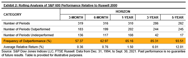 The S&P 600’s historical outperformance has been consistent over various rolling time periods, especially over longer horizons. Indeed, Exhibit 2 shows that the S&P 600 outperformed the Russell 2000 in 202 of the 310 (or 65%) rolling one-year periods between Dec. 31, 1994, and Sept. 30, 2021. The frequency of outperformance increased with the time horizons.