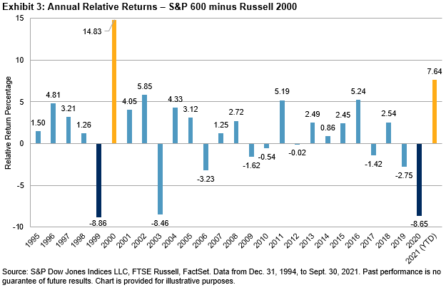 Despite the long-term track record, there have been periods where the S&P 600 has underperformed. For example, the S&P 600 underperformed by 8.86% and 8.65% in 1999 and 2020, respectively. These were the two worst calendar year periods for the S&P 600, based on relative returns. However, both examples were followed by substantial bounce backs in the following year. The S&P 600’s best year of relative performance came in 2000 (up 14.83%), and the S&P 600 has outperformed the Russell 2000 by 7.64% YTD in 2021, as of Sept. 30, 2021.