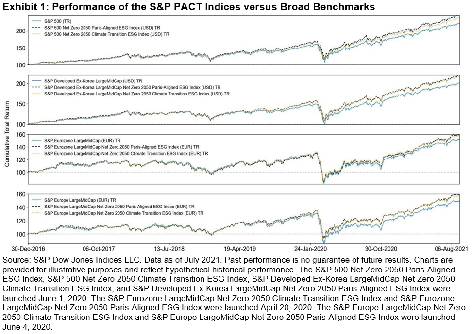 At S&P DJI we have created a series of rules-based indices that are designed to select a hypothetical portfolio of companies that collectively align with a 1.5°C scenario: the S&P PACTTM Indices (S&P Paris Aligned & Climate Transition Indices). Aligned with the ambitions of COP, these indices apply constraints for today, as well as with a 2050 outlook. There are immediate relative carbon footprint reductions of 30% or 50% relative to the benchmark, along with an ongoing requirement for the indices to decarbonize at a rate of 7% year-on-year. The indices are based on the latest climate science with the rate of annual decarbonization in line with, or beyond, the decarbonization trajectory from the IPCC’s 1.5°C scenario.